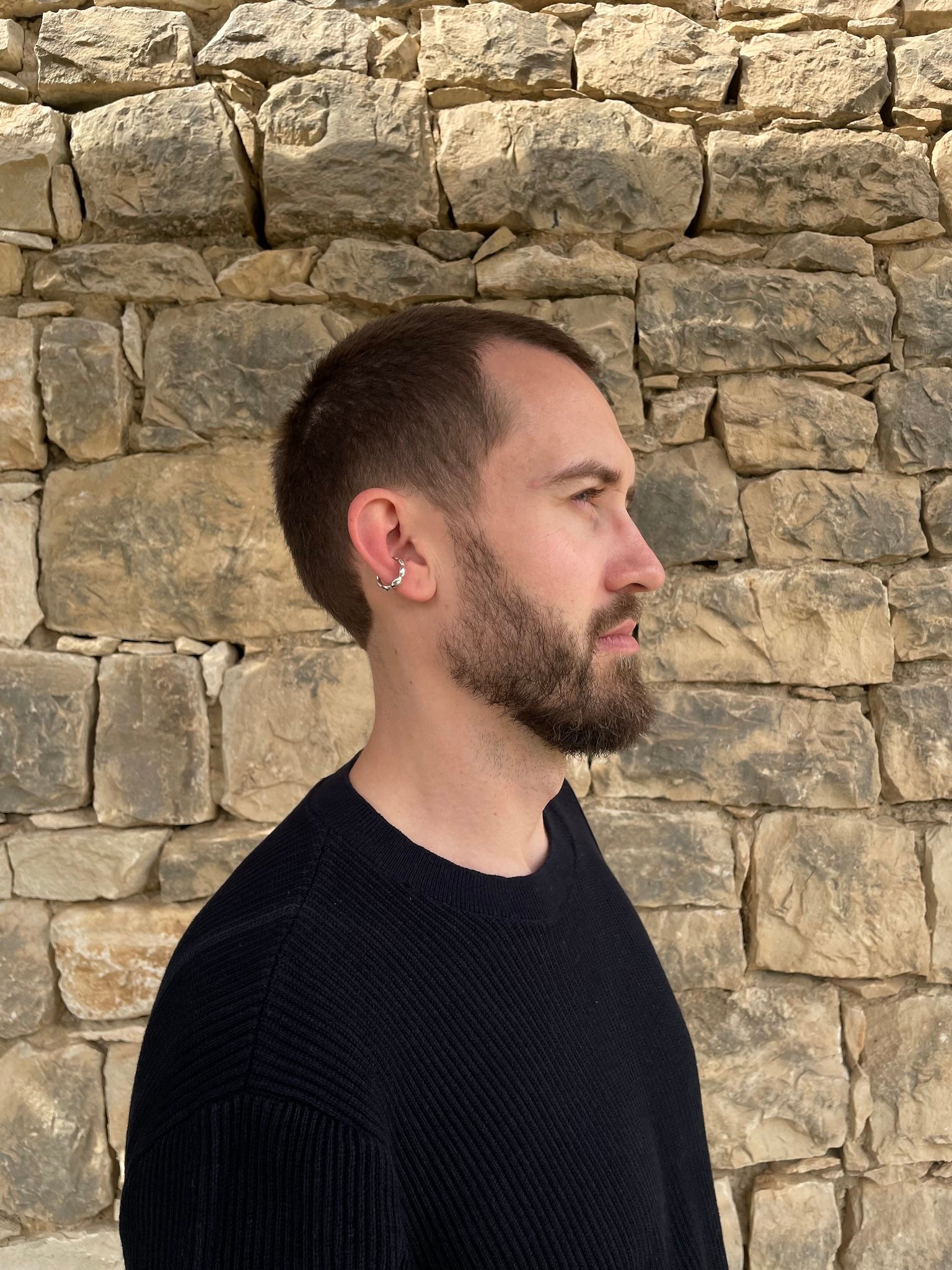 The Prologue Ear Cuff Serif supports an elegant look. A series of perfectly connected and finely polished round lenses creates a captivating interplay of light reflections. This cuff sits comfortably in the middle of the ear and pairs beautifully with other cuffs for a layered style.
